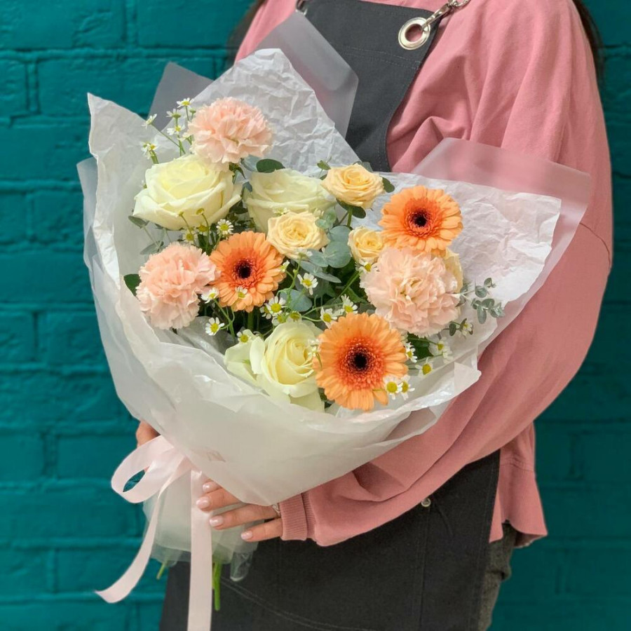 На фото букет «абрикосовый рассвет». В составе: роза 3 шт, кустовая роза 1 шт, гвоздика 3 шт, танацетум 3 шт, гербера 3 шт, писташ 2 шт, дизайнерская упаковка 1 шт, атласная лента 1 шт, . Все цветы свежие и ароматные, букет красиво оформлен и отлично подходит для подарка. Доступна доставка цветов или самовывоз.