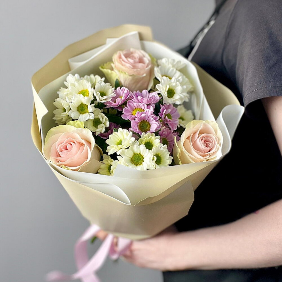 На фото букет «нежный свет». В составе: роза 3 шт, хризантема кустовая 4 шт, дизайнерская упаковка 1 шт, атласная лента 1 шт, . Все цветы свежие и ароматные, букет красиво оформлен и отлично подходит для подарка. Доступна доставка цветов или самовывоз.